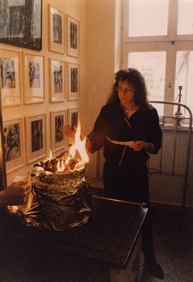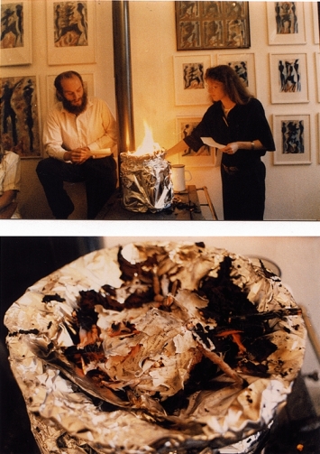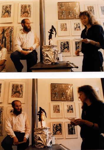 Bilderflut meiner Dämonenverbrennung verlangte nach einer Verbildlichung des Malprozesses in Form einer Performance. Galerist Andreas Link und ich lasen abwechselnd Gedichte und Fragmente, die von Verwandlung und