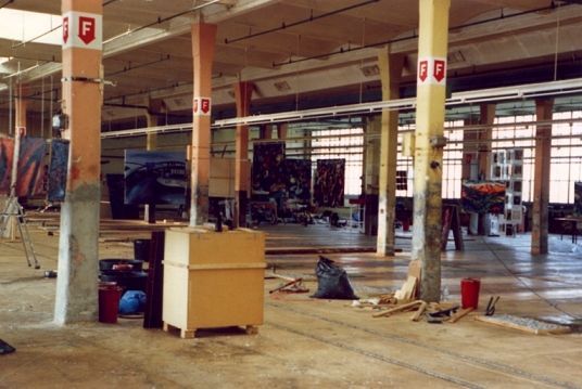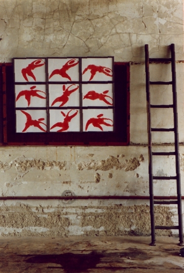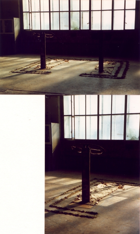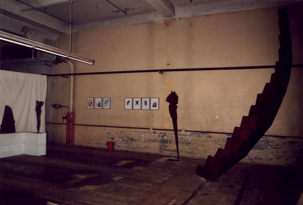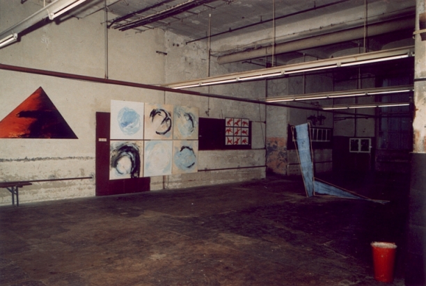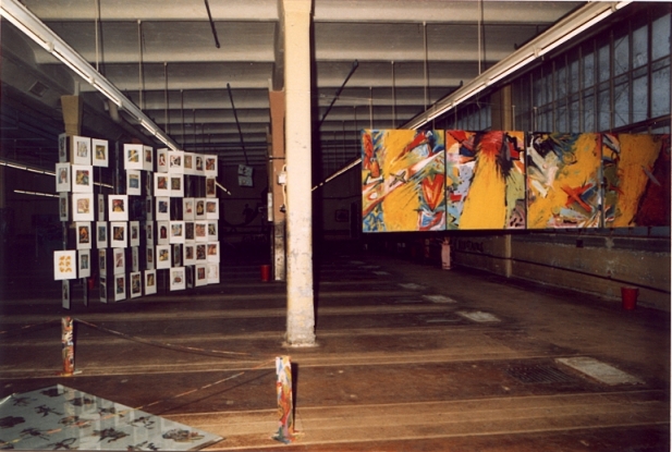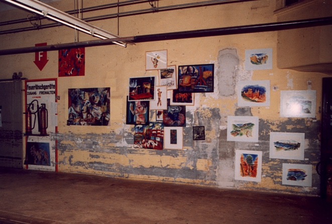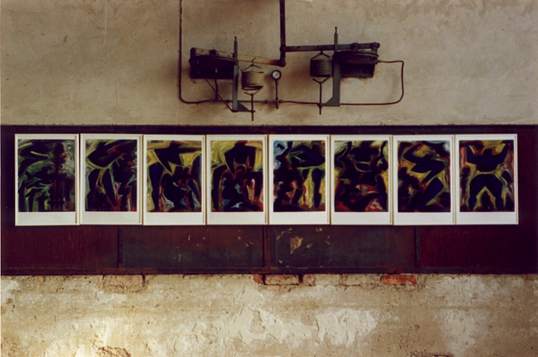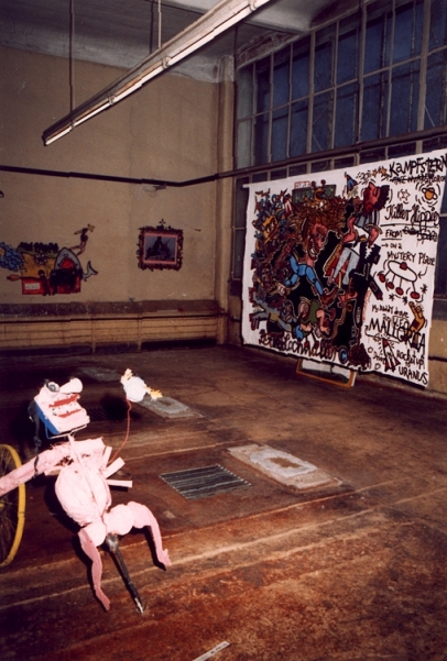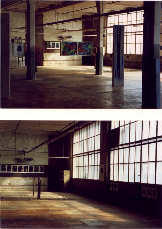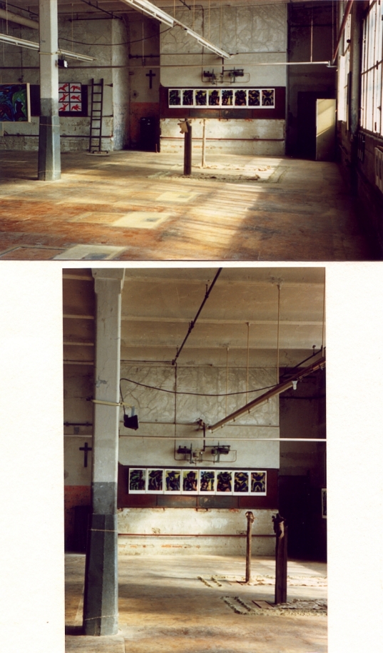 Die große Mutter, Öl/Karton, 1989, 75x100 cm Taubheit oder Ignoranz, Öl/Karton, 1989, 75x100 cm unten links: ... mehr Raum ..., Schablonendruck auf Papier, 1989, 95x126 cmunten: die Stelen für die Spinnmaschinen |