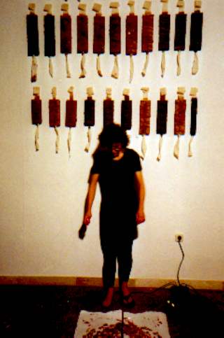 sich ab, wieder und wieder, ein Kreis entsteht. Ich teile den Kreis in zwei Hälften, dann nähe ich sie wieder zusammen. Die Performance erzeugte in der Galerie eine so dichte Spannung im Publikum, dass es