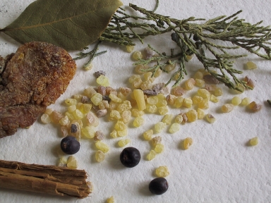 Wacholderbeeren im Mörser fest stampfen. Dann einen halben Teelöffel Weihrauchharz und ein haselnußgroßes Stück Pinien- oder Kiefernharz dazu und verreiben, bis ein Pulver entsteht. 1 cm Zimtstange, ein