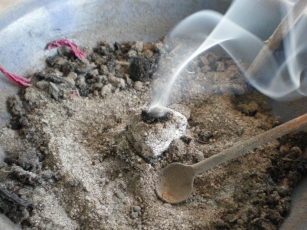z.B. einige Krümel Harz, eine Prise getrocknete Kräuter oder Räuchermischung, und das Abgebrannte mit einem Stäbchen von der Kohle wieder abräumen, bevor erneut Sand und Räucherwerk aufgelegt wird.